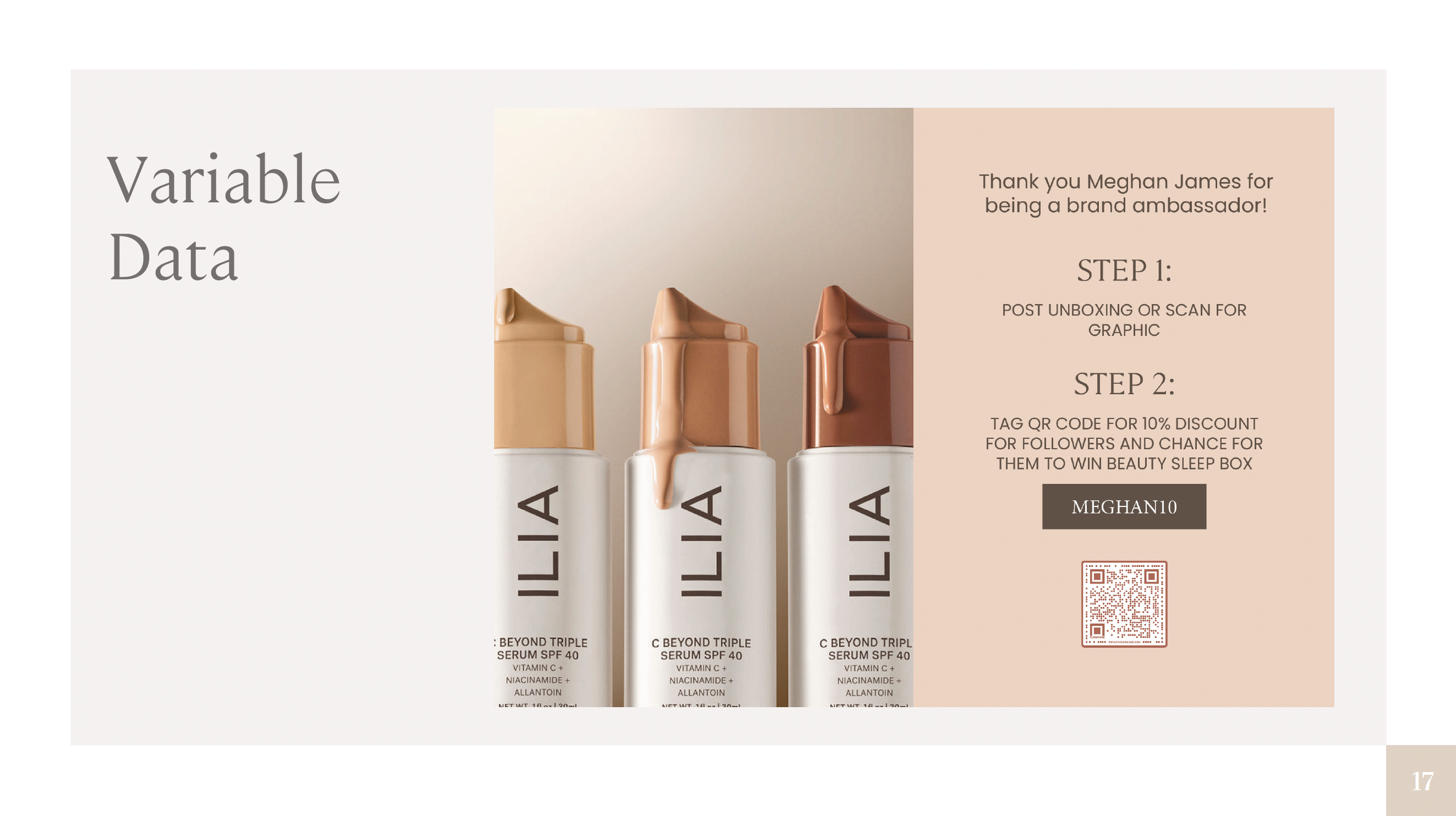 A custom promotional graphic was created for influencers to encourage social sharing. ILIA affiliates earn 10% commission on sales, so ambassadors are incentivized to post either an unboxing video or the provided graphic via a QR code. Each ambassador receives a unique promo code, offering followers 10% off and entry into a giveaway for a Beauty Sleep Box.